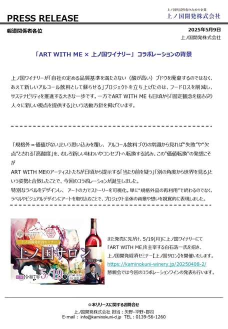 上ノ国開発株式会社(所在地:北海道檜山郡上ノ国町湯ノ岱243-4 代表取締役:丸山和之、以下上ノ国開発)は、障害福祉とアートを融合させた革新的な支援プログラム「ART WITH ME」とコラボーレーションし新しいアルコール飲料「ART WITH ME ×上ノ国ワイナリー」を5/19(月)に発売します。また同日に、上ノ国ワイナリー(所在地 同上)にて実施する上ノ国開発経済セミナー【上ノ国サロン】にて今回の商品の発表を行います。