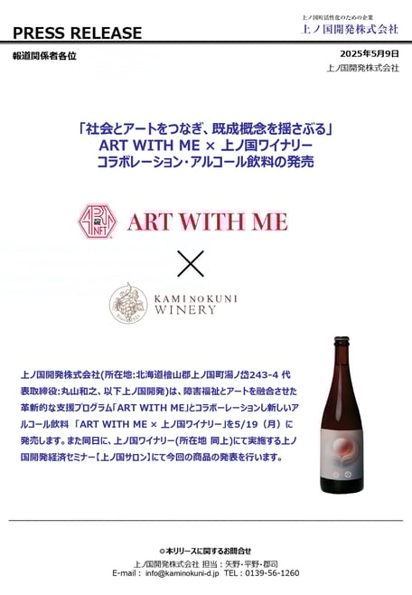 上ノ国開発株式会社(所在地:北海道檜山郡上ノ国町湯ノ岱243-4 代表取締役:丸山和之、以下上ノ国開発)は、障害福祉とアートを融合させた革新的な支援プログラム「ART WITH ME」とコラボーレーションし新しいアルコール飲料「ART WITH ME ×上ノ国ワイナリー」を5/19(月)に発売します。また同日に、上ノ国ワイナリー(所在地...